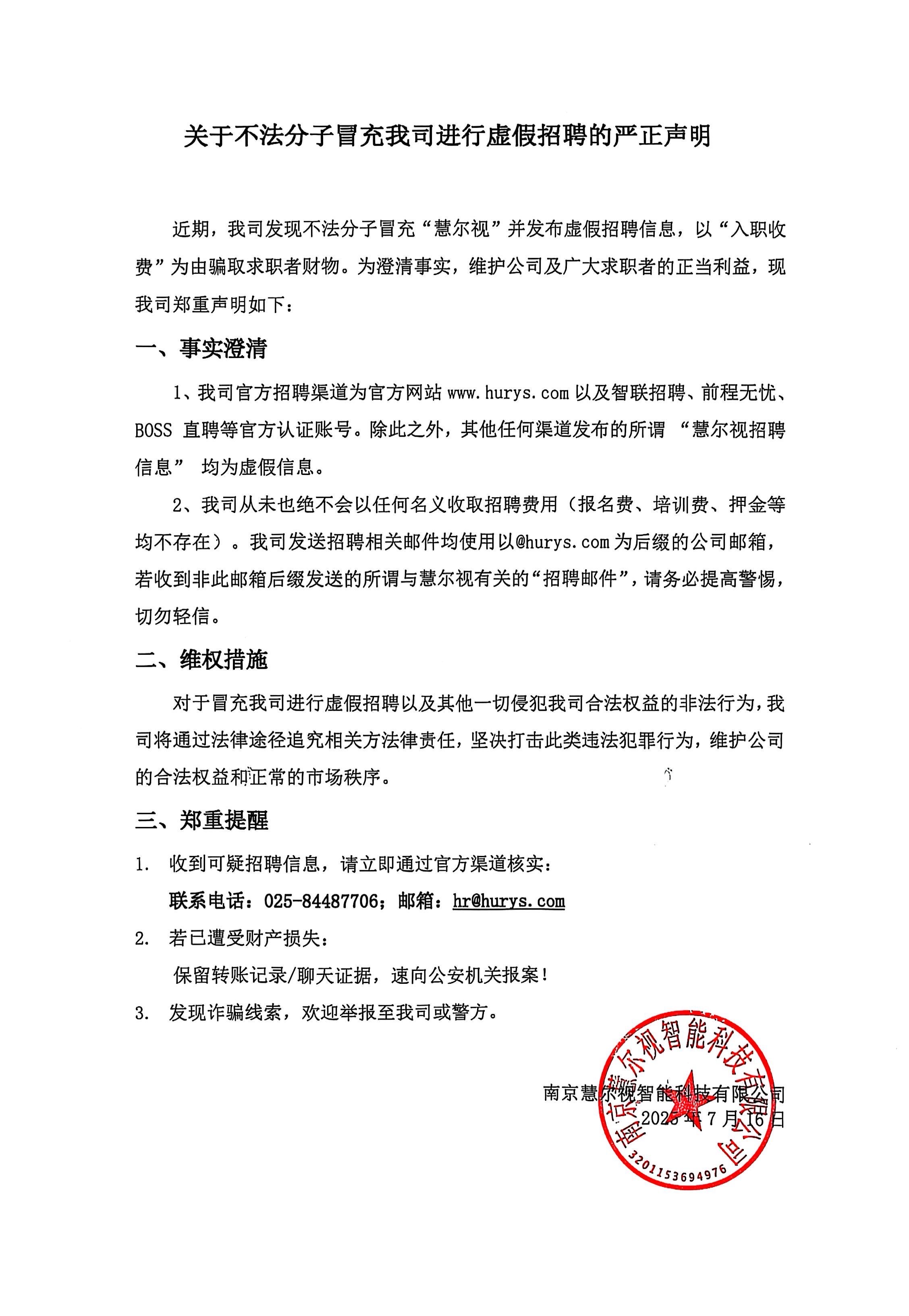 關于不法分子冒充我司進行虛假招聘的嚴正聲明